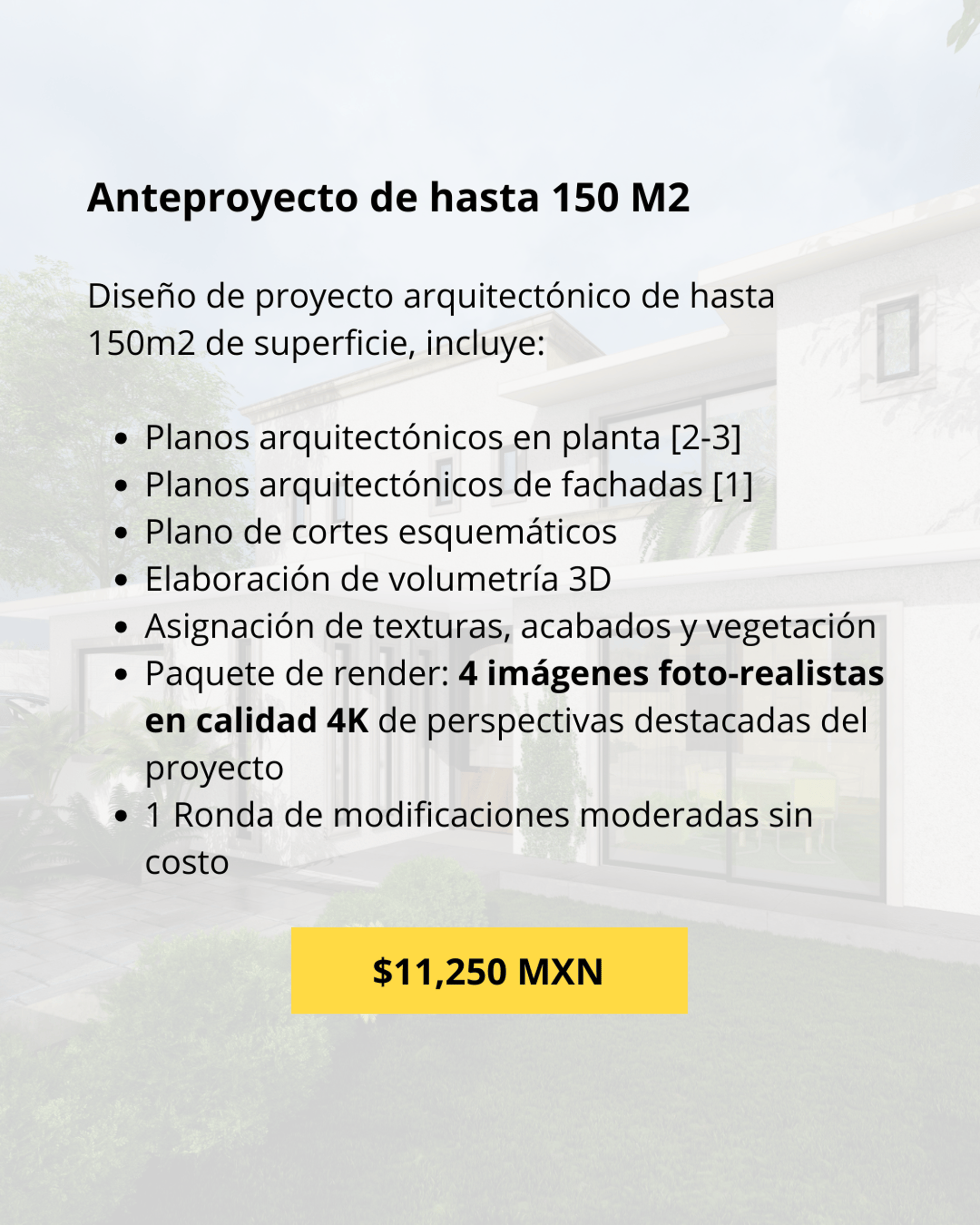 Diseño de proyecto arquitectónico de hasta 150m2 de superficie, incluye: