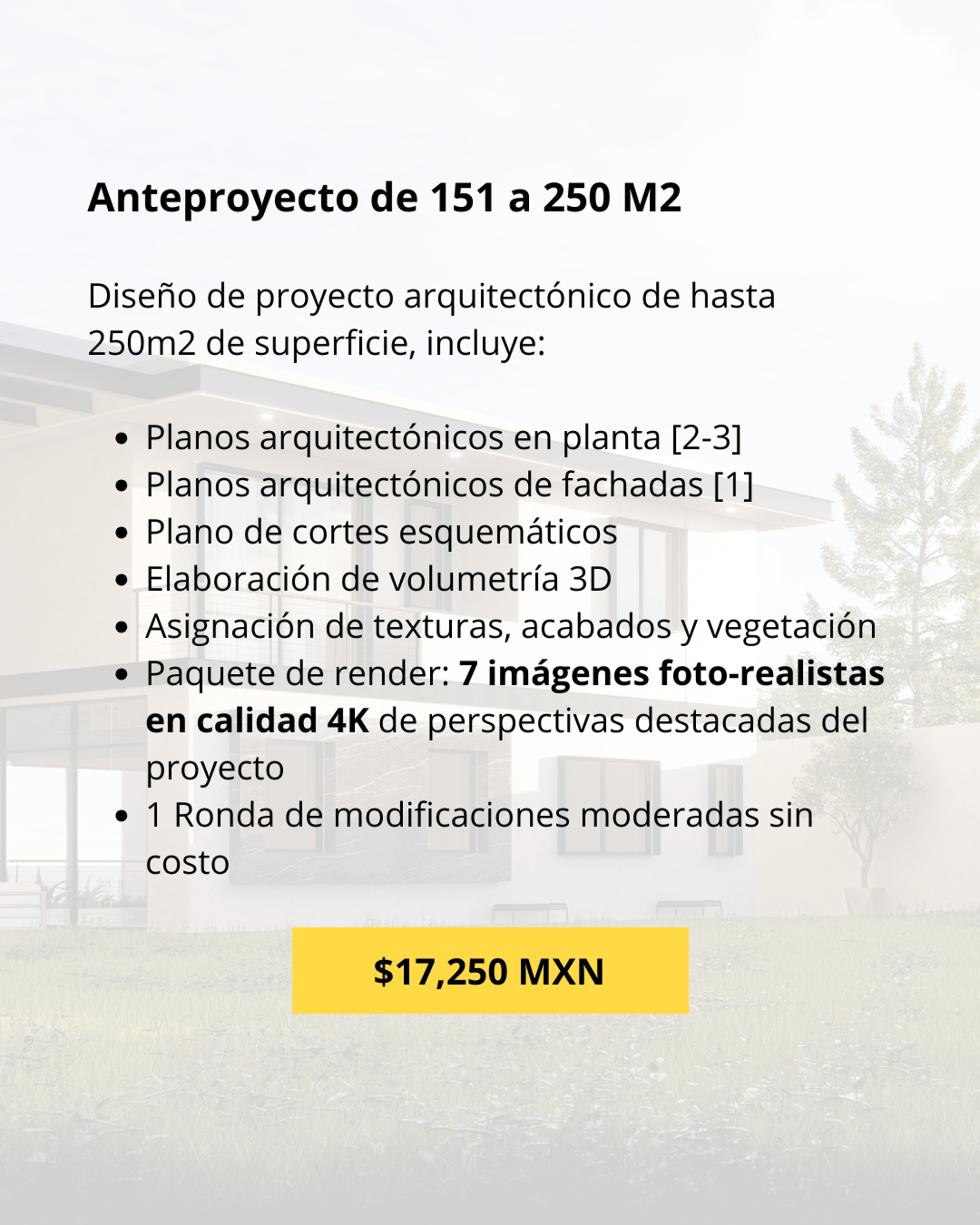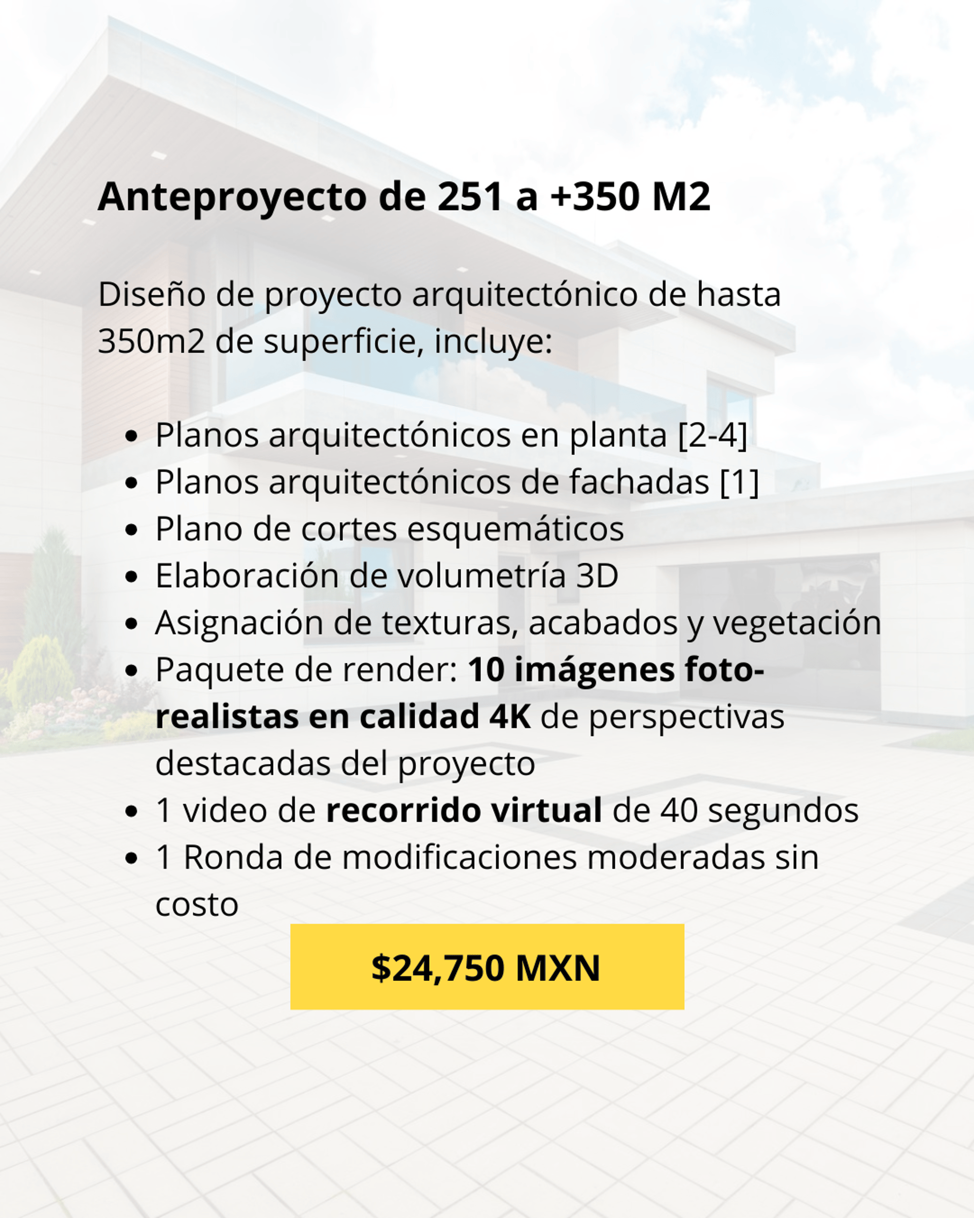 Diseño de proyecto arquitectónico de hasta 350m2 de superficie, incluye: